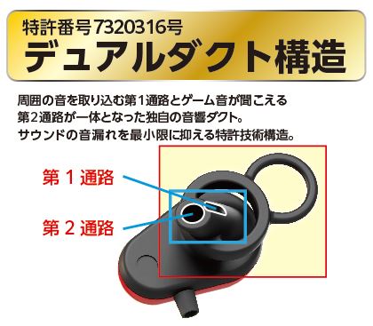 特許技術『デュアルダクト構造』によりゲーム音と環境音を同時に取り入れることができるオープン型でもカナル型でもない全く新しいイヤホンです。